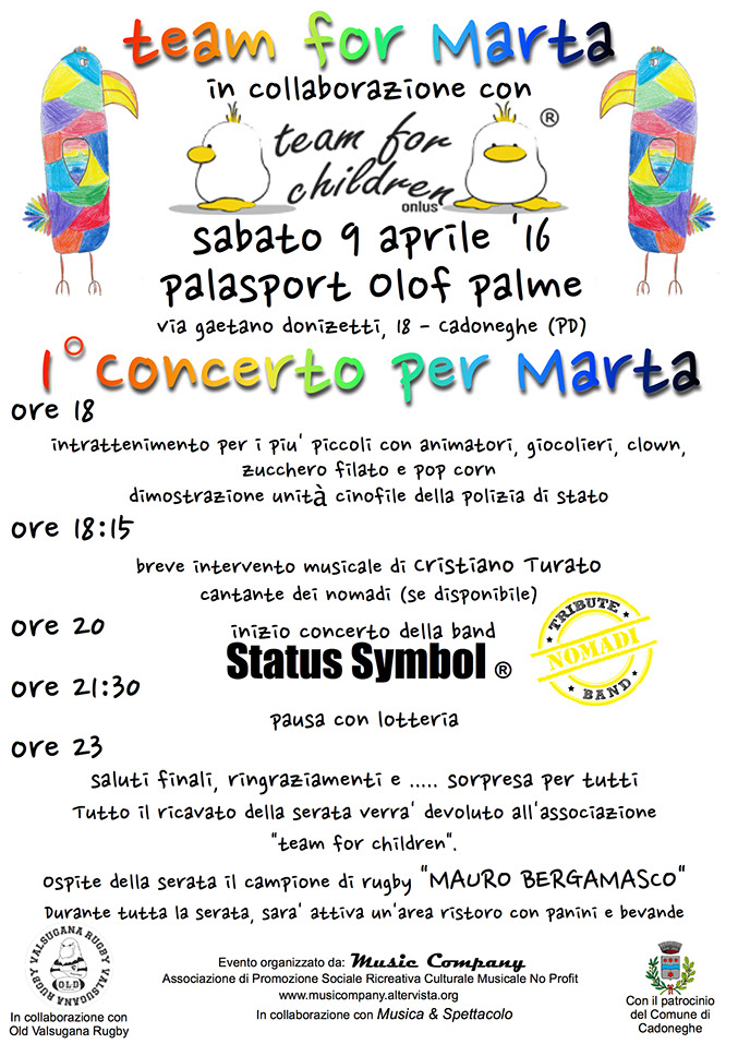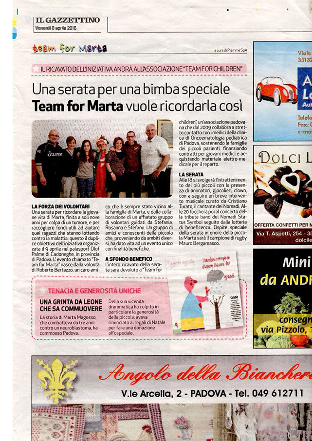 In occasione del primo concerto organizzato dal gruppo di volontari Team For Marta abbiamo raccolto la considerevole somma di circa €8500,00, i quali saranno destinati alla ONLUS Team For Children che li userà per la fondazione del reparto Teen Zone presso l'ospedale di Padova - reparto di oncoematologia pediatrica, per aiutare gli adolescenti durante il percorso della chemioterapia. Un Grazie di Cuore a tutti voi!